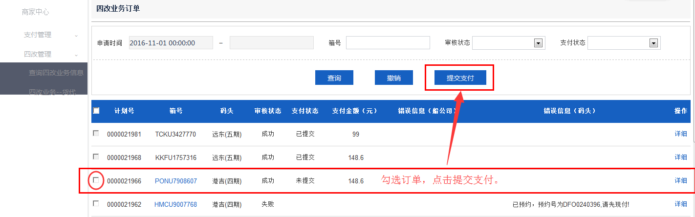 - 2.1四改管理 ——查詢四改業(yè)務(wù)信息頁面查詢結(jié)果詳情,勾選并點(diǎn)擊提交支付